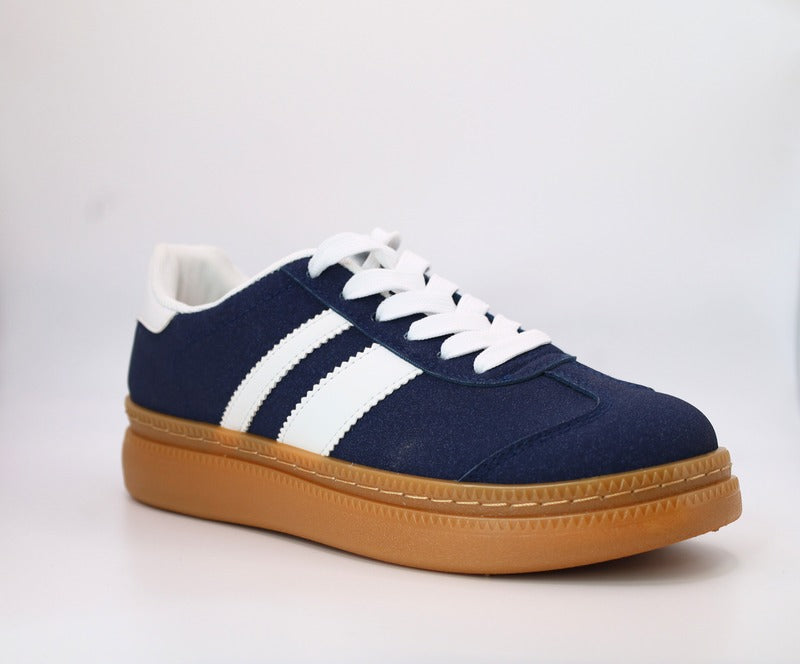 The Cozzy Girl BH005 blends comfort and style with a sporty, retro-inspired design made for everyday wear. Featuring a navy faux-suede upper accented by crisp white double stripes, these sneakers deliver a timeless look that pairs effortlessly with jeans, joggers, or a casual dress. The soft interior lining and lace-up closure ensure a snug, comfortable fit, while the durable gum rubber sole adds traction and a vintage edge. Whether you’re running errands or out with friends, the BH005 keeps your style relaxed and effortlessly cool.