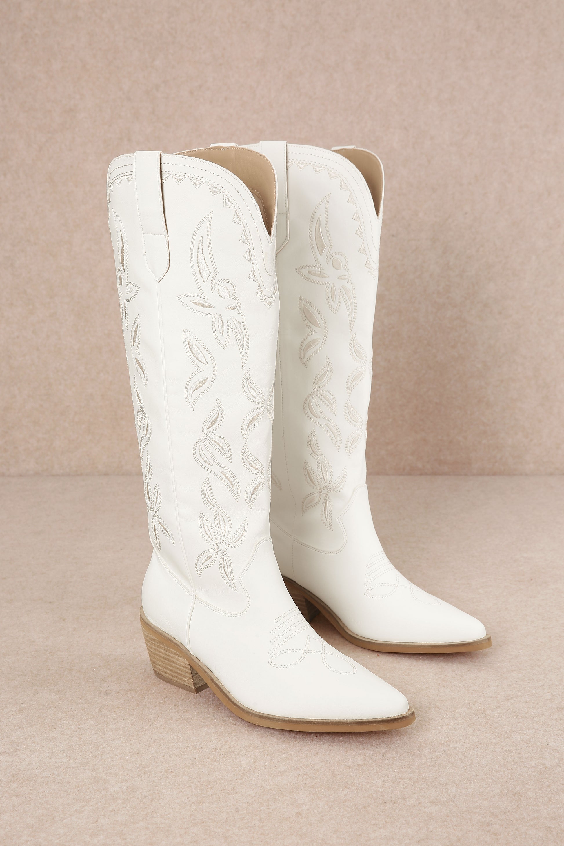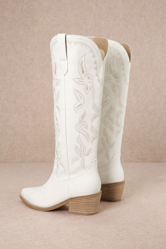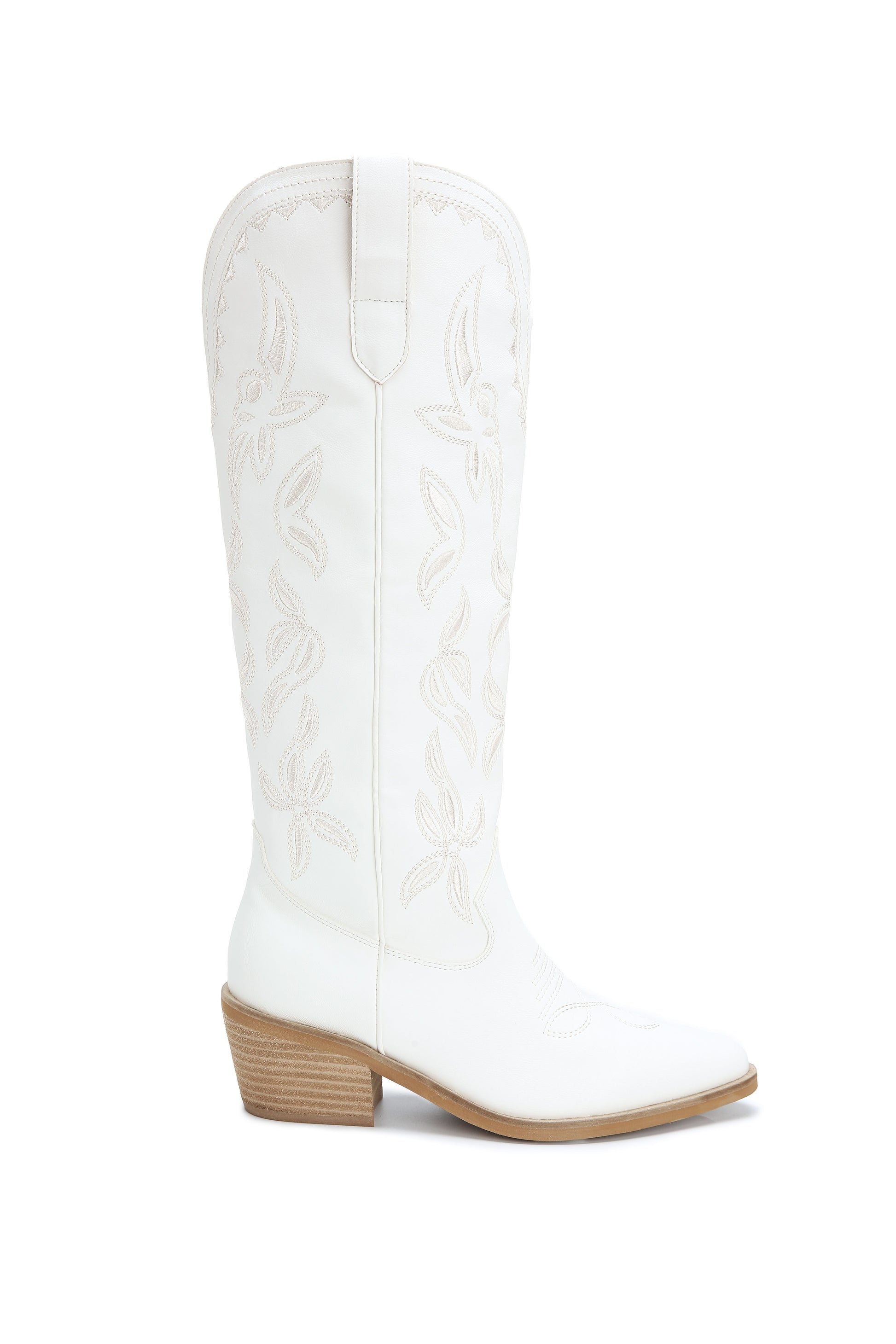 Step into bold, western-inspired style with the Miracle Miles Enora Boot in White. Designed with intricate tonal stitching and a classic tall shaft, this boot pairs timeless cowgirl charm with modern flair. The smooth faux leather finish and pointed toe add a clean, polished look, while the stacked wooden heel provides just the right lift for all-day comfort. Whether you're styling for game day, concerts, or everyday flair, the Enora in white is your go-to boot for standout style.
