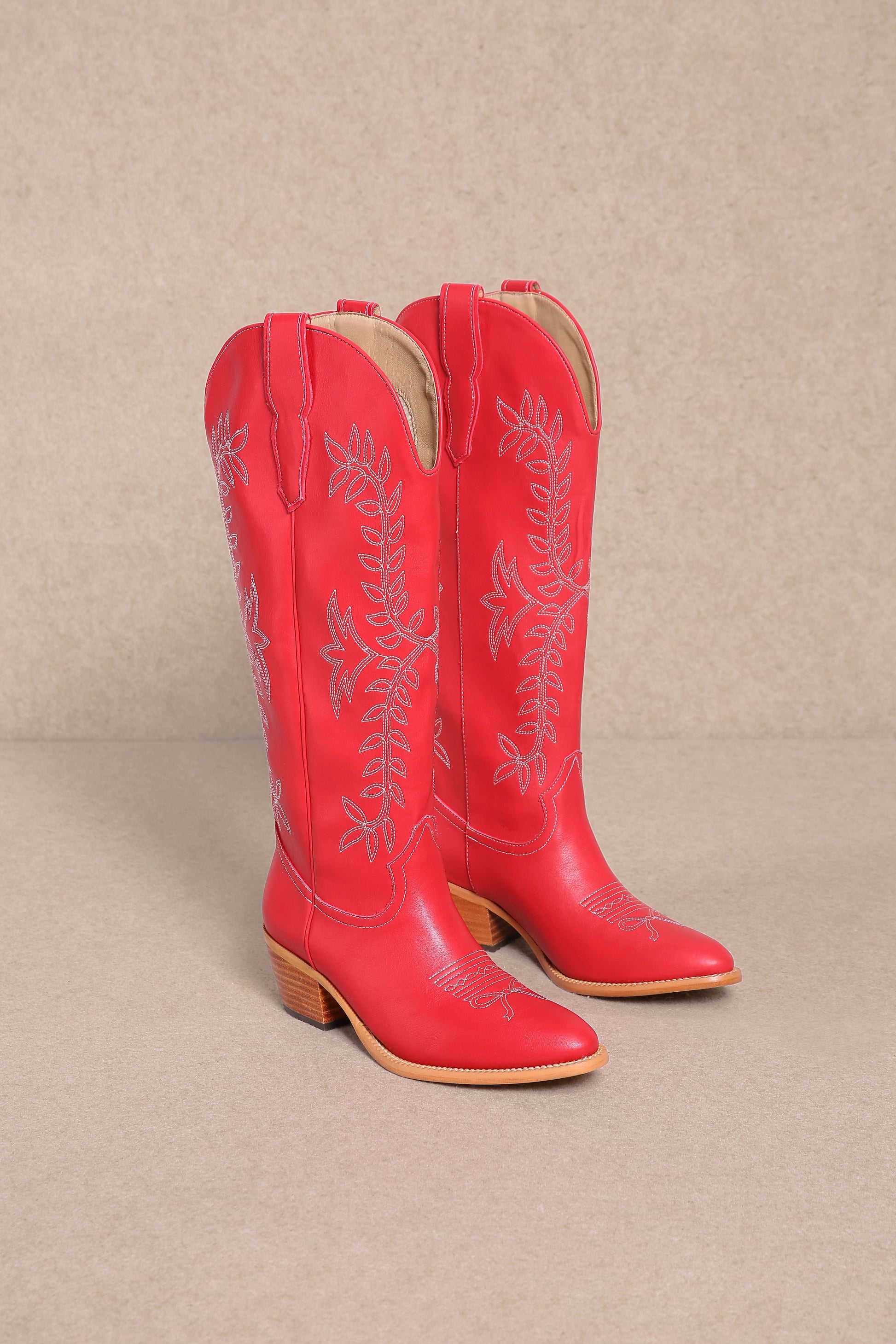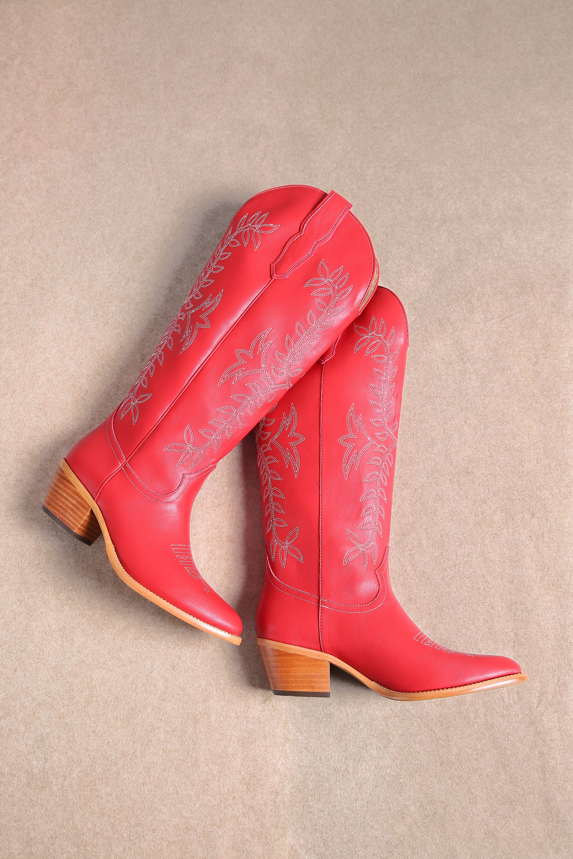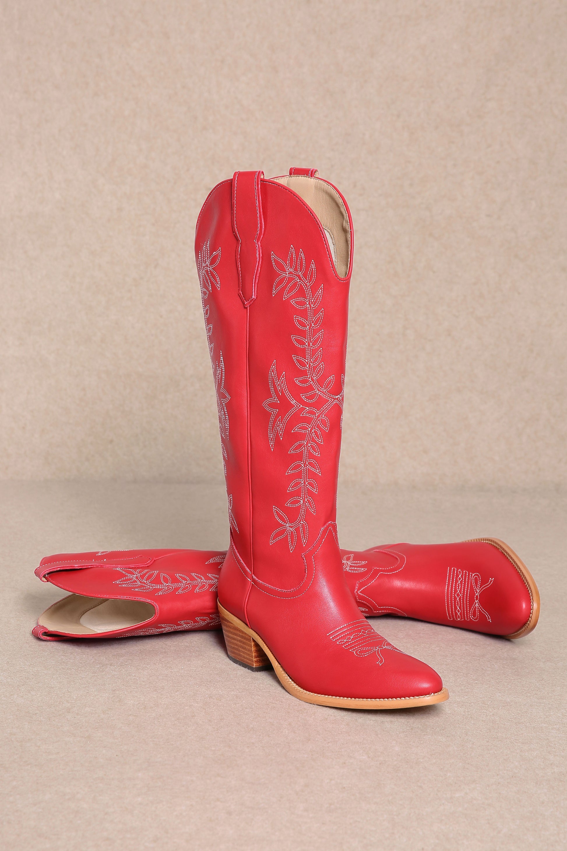 Turn heads with bold western flair in the Stella Boot by Miracle Miles. These vibrant red knee-high boots feature eye-catching white embroidery and a sleek, pointed toe for a classic cowgirl look. The stacked wooden heel and roomy calf fit ensure all-day comfort without sacrificing style. Whether you're headed to a concert, game day, or just brunch with the girls—Stella brings the statement.