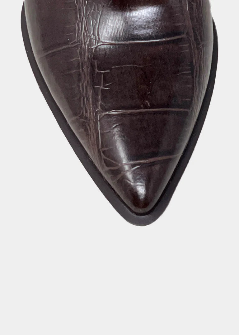 Step into the season with elevated elegance in the Shu Shop Vanessa Knee-High Boot in Brown Croco. Designed with a luxe faux croc-embossed upper, this standout style features a flattering pointed toe, sleek below-the-knee shaft, and an easy pull-on structured silhouette. The soft synthetic lining and textured rubber outsole offer comfort and grip, while the 2.5" kitten heel adds just the right amount of lift. Perfect for pairing with flowy skirts or structured leather looks, Vanessa is your go-to boot for chic, cooler-weather dressing.